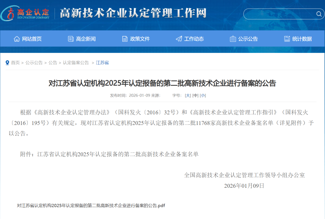 近日,根据《高新技术企业认定管理办法》及相关规定,全国高新技术企业认定管理工作领导小组办公室对江苏省认定机构2025年认定报备的第二批企业进行备案公示。开云·Kaiyun凭借其扎实的科技创新实力与完善的研发管理体系,成功荣列在本次备案中。